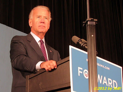 FAIRBORN, OH -- The Obama 2012 presidential campaign paid another visit to Ohio when Vice President Joe Biden addressed a "grassroots" gathering of several hundred enthusiastic supporters Wednesday afternoon at Wright State University, located just outside Dayton. Air Force Two arrived at Wright-Patterson Air Force Base just after 12PM, and he was greeted by a military delegation headed by General Janet Wolfenbarger, the Air Force's first four-star general and commander of the Air Force Material Command. The vice president's motorcade made the short trip to the campus and passed several demonstrators expressing their dissatisfaction with the Obama administration from a location just across the street from the venue. Before coming into the main hall, Biden visited with folks who were in the event's overflow area to express his thanks for their turn-out for his appearance.